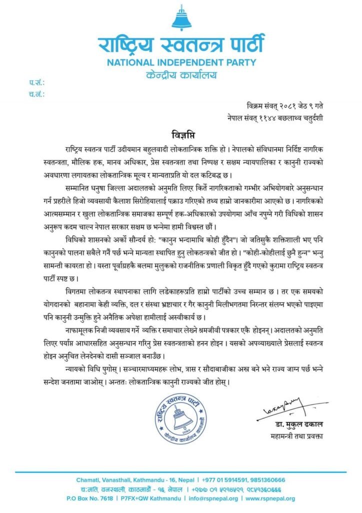 काठमाडौ । राष्ट्रिय स्वतन्त्र पार्टी (रास्वपा)ले अदालतको अनुमति लिएर पर्याप्त आधारसहित अनुसन्धान गरिनु प्रेस स्वतन्त्रताको हनन नभएको बताएको छ ।