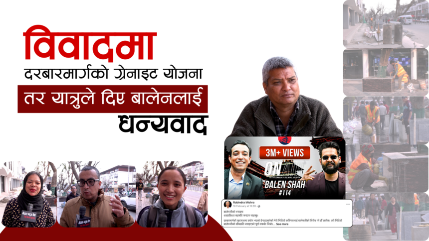 काठमाडौं । काठमाडौं महानगरपालिकाले दरबारमार्गको फुटपाथमा बिछ्याइरहेको ग्रेनाइटको विषयलाई लिएर केही दिनदेखि सामाजिक सञ्जालमा विवाद भइरहेको छ । विभिन्न राजनीतिक दलका नेताहरु एवम अभियन्ताहरुले समेत खुलेरै विरोध जनाइरहेका छन् ।