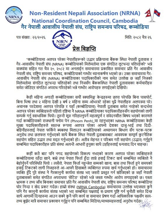 एनआरएनए कम्बोडियाको बचाउ: ठगीलाई ‘सहयोग’ को संज्ञा, कानुनी कारबाहीको धम्की!
