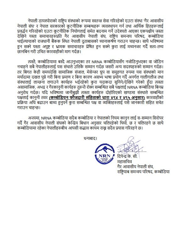 संस्थाका महासचिव दिपेन्द्र के.सी. द्वारा हस्ताक्षरित विज्ञप्तिमा कम्बोडियन फौजदारी संहिता उल्लेख गर्दै मिडिया र सामाजिक सञ्जालमा लेख्नेहरूलाई कारबाही गर्ने चेतावनी दिइएको छ। तर, विज्ञप्तिमा नेपाल सरकारले आफ्ना उपाध्यक्ष रामजी क्षेत्री विरुद्ध जारी गरेको पक्राउ पुर्जी र वैदेशिक रोजगार ठगी मुद्दाबारे भने पूर्ण रूपमा मौनता साधेको छ।