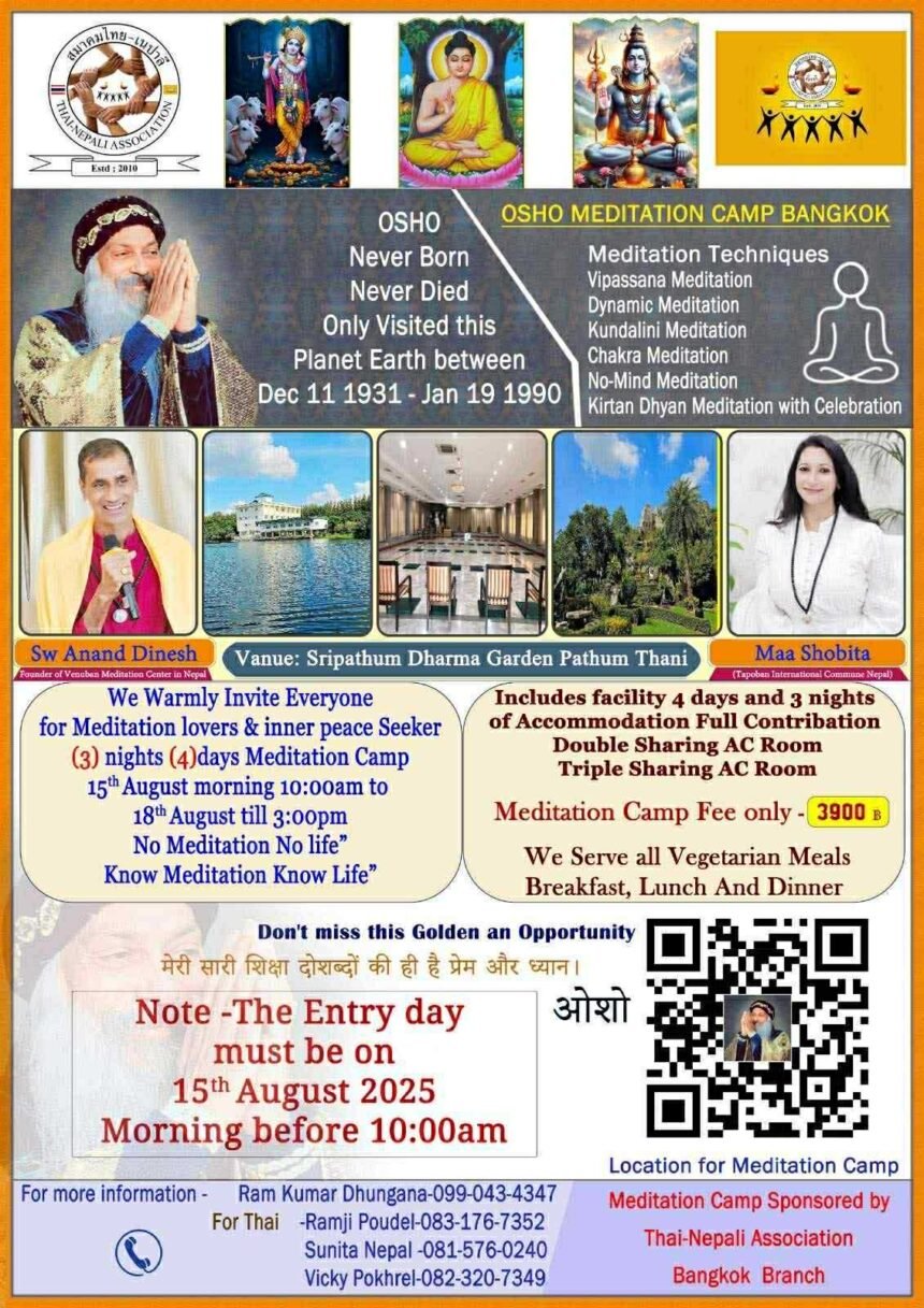 बैंकक, अगस्ट १५ – १८ मा आन्तरिक शान्तिको खोजीमा रहेका नेपाली तथा अन्तर्राष्ट्रिय ध्यान प्रेमीहरूका लागि एक विशेष अवसर आउँदैछ। ओशोको शिक्षामा आधारित ३ रात ४ दिनको विशेष ध्यान शिविर यस वर्षको अगस्ट महिनामा थाईल्यान्डको राजधानी बैंककमा आयोजना हुँदैछ।