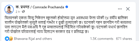 चितवनको एकता शिशु निकेतन स्कुलको होस्टेलमा मृत अवस्थामा फेला परेकी १४ वर्षीय बालिका शालीन पोखरेलको मृत्युबारे चासो राख्दै प्रधानमन्त्री दाहालले घटना गम्भीर रहेको भन्दै सम्बन्धीत निकायलाई निर्देशन दिनुभएको हो ।
