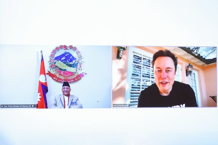 काठमाडौं । प्रधानमन्त्री केपी शर्मा ओलीले सामाजिक सञ्जाल एक्सका मालिक एलन मस्कसँग भर्चुअल वार्ता गरेका छन् । प्रधानमन्त्री ओलीको सामाजिक सञ्जालमार्फत मस्कसँग भर्चुअल कुराकानी भएको प्रधानमन्त्रीको सचिवालयले जनाएको छ ।