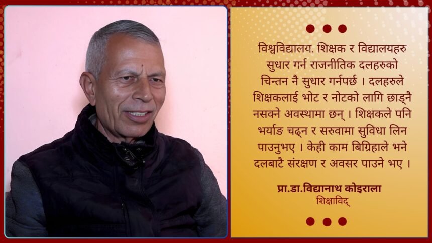 विश्वविद्यालय, शिक्षक र विद्यालयहरु सुधार गर्न राजनीतिक दलहरुको चिन्तन नै सुधार गर्नपर्छ । दलहरुले शिक्षकलाई भोट र नोटको निम्ति छाड्नै नसक्ने अवस्था छन् । शिक्षकले पनि भर्याङ चढ्न पाइहाल्ने भए । सरुवामा सुविधा लिन पाए । गढबढ गरिहाले भने संरक्षण र अवसर पाउने भए ।