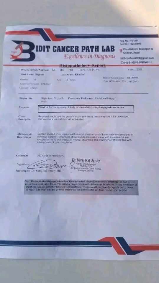 बुबा राज बहादुर खड्का र आमा उजेली खड्काका एक मात्र छोरा बिग्नेश खड्काको अहिले घाँटीमा क्यान्सर भएको पत्ता लागेको हो ।