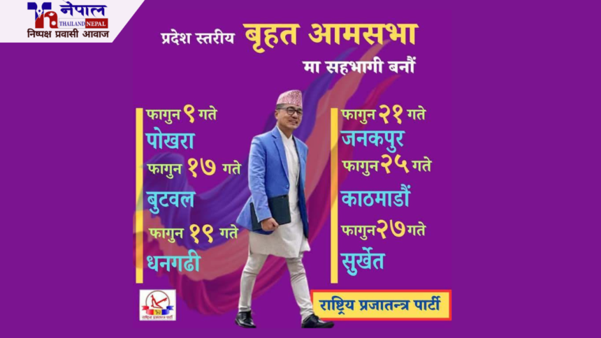 काठमाडौं । राष्ट्रिय प्रजातन्त्र पार्टी (राप्रपा)ले यही फागुन महिनामा प्रदेशस्तरीय आमसभा गर्ने भएको छ ।