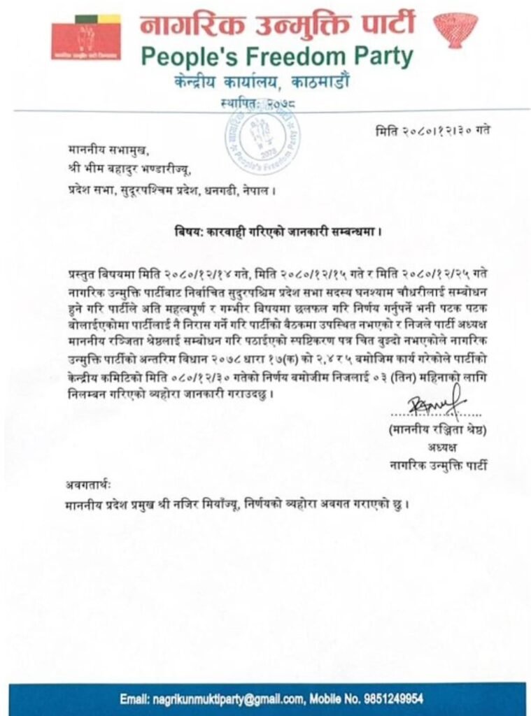 प्रदेश सभामुख भीमबहादुर भण्डारीलाई शुक्रबार लिखित जानकारी गराउँदै अध्यक्ष श्रेष्ठले चौधरी पार्टीको तीन वटा बैठकमा अनुपस्थित रहेको भन्दै कारवाही गरिएको बताउनुभएको छ ।