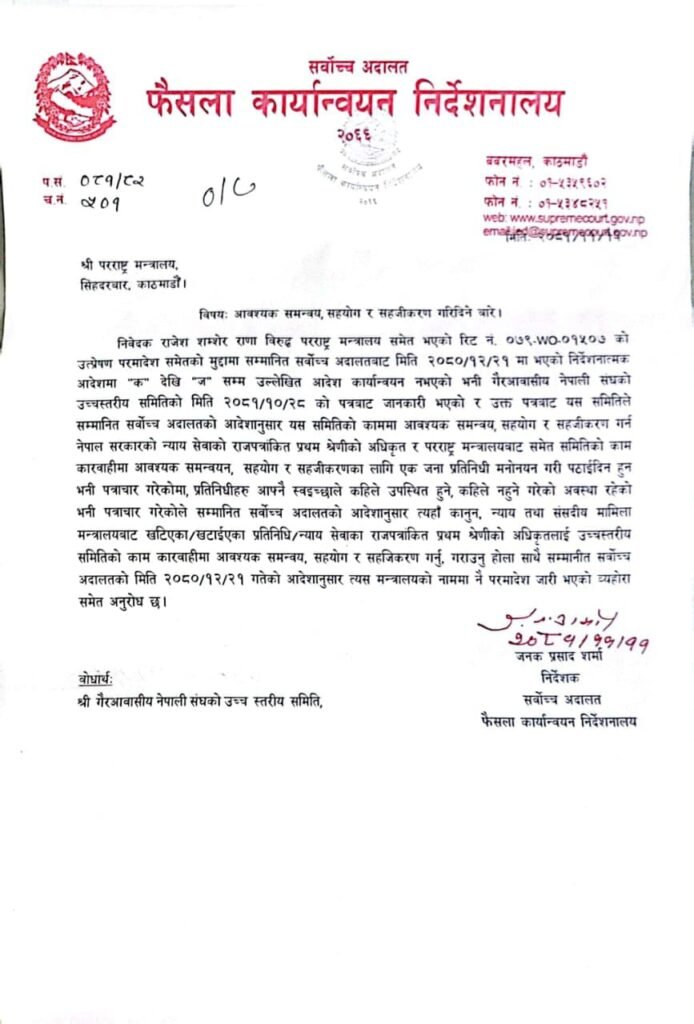सर्वोच्च अदालतको आदेश अनुसार, गैरआवासीय नेपाली संघको सम्पूर्ण प्रशासनिक कार्य उच्चस्तरीय समितिले सम्हाल्ने भएको छ। सर्वोच्च अदालतको २०८०/१२/२१ गतेको आदेश अनुसार, संघको सम्पत्ति, दस्तावेज, बैंक खाता र प्रशासनिक व्यवस्थापन उच्चस्तरीय समितिलाई हस्तान्तरण गर्न निर्देशन दिइएको हो।