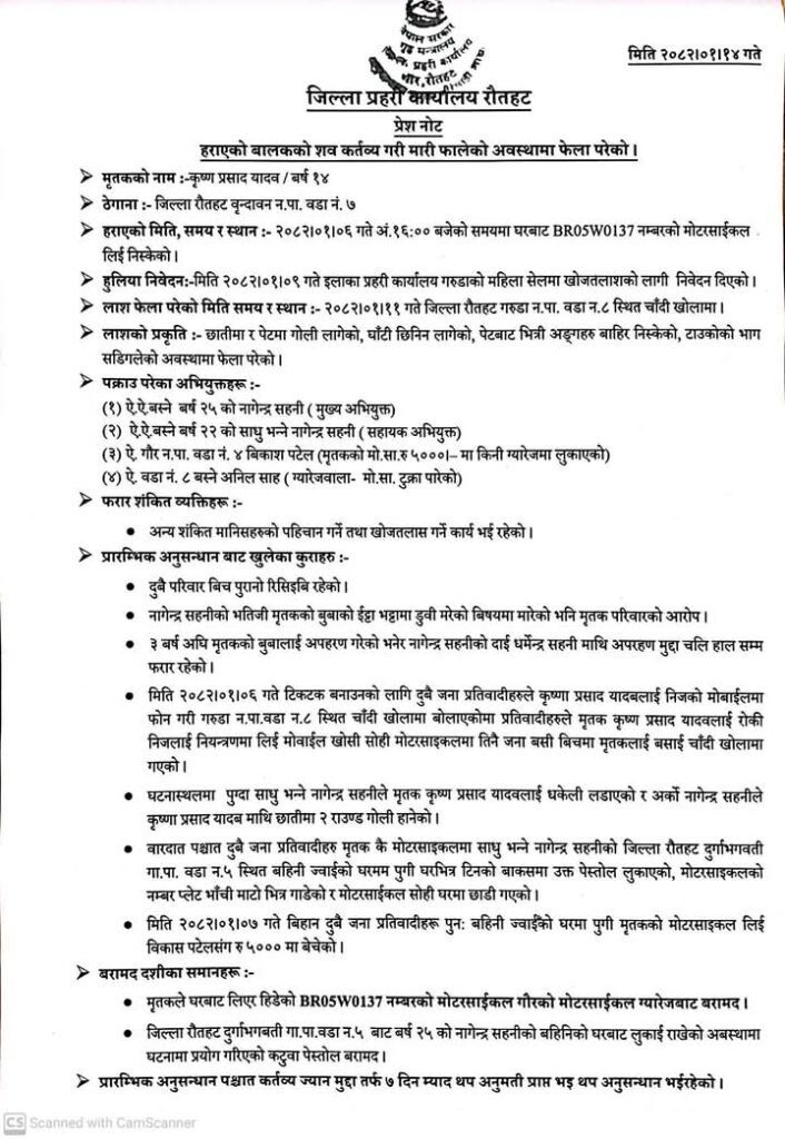प्रहरीका अनुसार १४ वर्षीय बालकलाई टिकटिक बनाउन जाने भन्दै घरबाट बोलाएर चाँदी खोलामा पु¥याई गोली हानी हत्या गरेको पाइएको हो । रौतहटका प्रहरी उपरीक्षक दिलिप घिमिरेका अनुसार बालकको छातीमा २ राउन्ड गोलि हानी हत्या भएको प्रारम्भिक अनुसन्धानमा देखिएको छ ।
