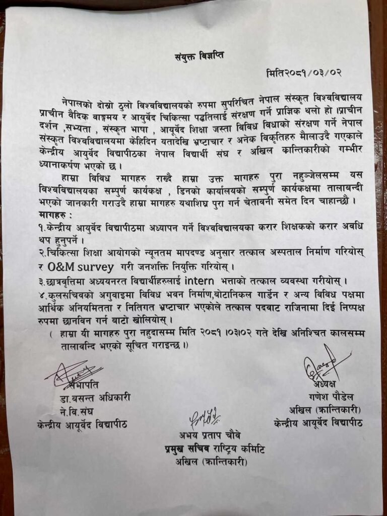 साथै कुलसचिबले तत्काल राजीनामा दिनुपर्ने उनीहरुको माग छ । नेविसंघका विद्यापीठ सभापति डा. बसन्त अधिकारी, अखिल क्रान्तिकारी विद्यापीठका अध्यक्ष गणेश पौडेल र प्रमुख सचिब चौवेले विज्ञप्ति जारी गरि अनिश्चित कालकालागि तालाबन्दी गरिएको बताए ।