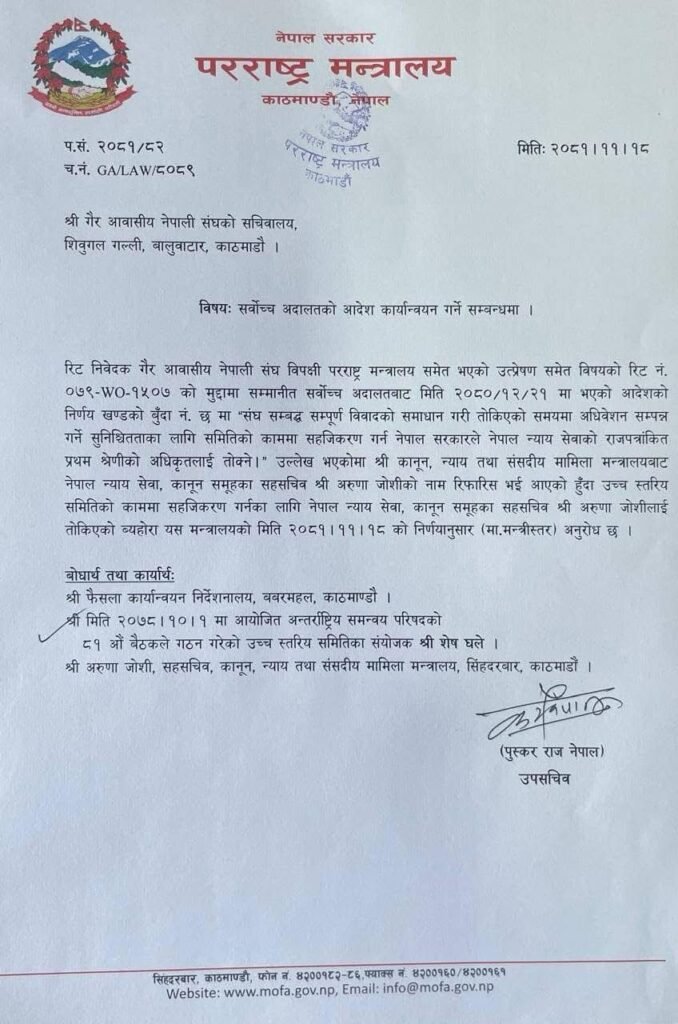 सर्वोच्च अदालतको परमादेश र फैसला कार्यान्वयन निर्देशनालयले हालै गरेको पत्राचारका आधारमा परराष्ट्र मन्त्रालयको मन्त्रीस्तरीय निर्णयले सहसचिव अरुणा जोशीलाई प्रतिनिधि तोकेर पत्राचार गरेको हो ।