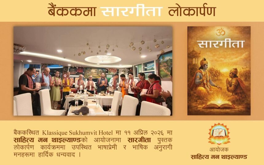 बैंकक, थाइल्याण्ड । नेपाली भाषा, कला र संस्कृतिको प्रवर्धन सक्रिय संस्था साहित्य मन थाइल्याण्डको आयोजनामा बैंककमा एक भव्य साहित्यिक तथा धार्मिक समारोहका बीच ‘सारगीता’ नामक पुस्तकको लोकार्पण गरिएको छ। शनिबार आयोजित उक्त विशेष कार्यक्रममा प्रवासमा रहेका नेपाली समुदायका प्रतिष्ठित व्यक्तित्वहरू, साहित्यकार र समाजसेवीहरूको उत्साहजनक उपस्थिति रहेको थियो।