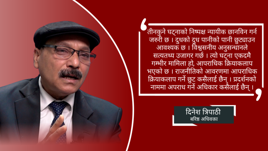 समसामयिक घट्ना र राजनीतिक उतारचढावका विषयमा तत्काल प्रतिक्रिया जनाउने दिनेश त्रिपाठी चर्चित एवं बरिष्ठ अधिवक्ता हुन् । उनी संवैधानिक कानूनका विज्ञ पनि हुन् । यही चैत्र १५ गते काठमाडौंको तीनकुनेमा राजतन्त्र पुर्नस्थापनाका लागि भन्दै गरिएको आन्दोलन हिंसात्मक भएपछि दर्जनौं प्रदर्शनकारी प्रहरीले पक्राउ गरेको छ । यसै सिलसिलामा पक्राउपछिको कानुनी कारवाही, आन्दोलनको समीक्षा र भावी कार्यदिशाका बारेमा थाइल्याण्ड नेपालले बरिष्ठ अधिवक्ता त्रिपाठीसँग कुराकानी गरेको छ ।