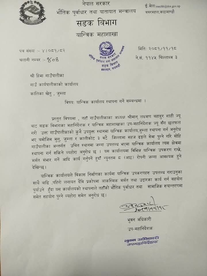 यान्त्रिक कार्यालयले आइतबार हिमा गाउँपालिकालाई परिपत्र गर्दै सडक विभागले भनेको छ,‘गाउँपालिकाका अध्यक्ष श्रीमान् लक्ष्मण बहादुर शाहीज्यूबाट सडक विभागका महानिर्देशक र यान्त्रिक महाशाखाका उप–महानिर्देशकज्यूसँग छलफल गरी उक्त गाउँपालिकाको कुनै उपयुक्त स्थानमा यान्त्रिक कार्यालय, जुम्ला स्थापना गर्न अनुरोध भए बमोजिम मुगु, जुम्ला र कालीकोट तीनवटै जिल्लामा सहज ढङ्गले सेवा पुग्नेगरी सोहि गाउँपालिका अन्तर्गत उचित स्थानमा जग्गा उपलब्ध भएमा यान्त्रिक कार्यालय त्यस क्षेत्रमा स्थापना गर्न सकिने व्यहोरा अनुरोध छ ।’