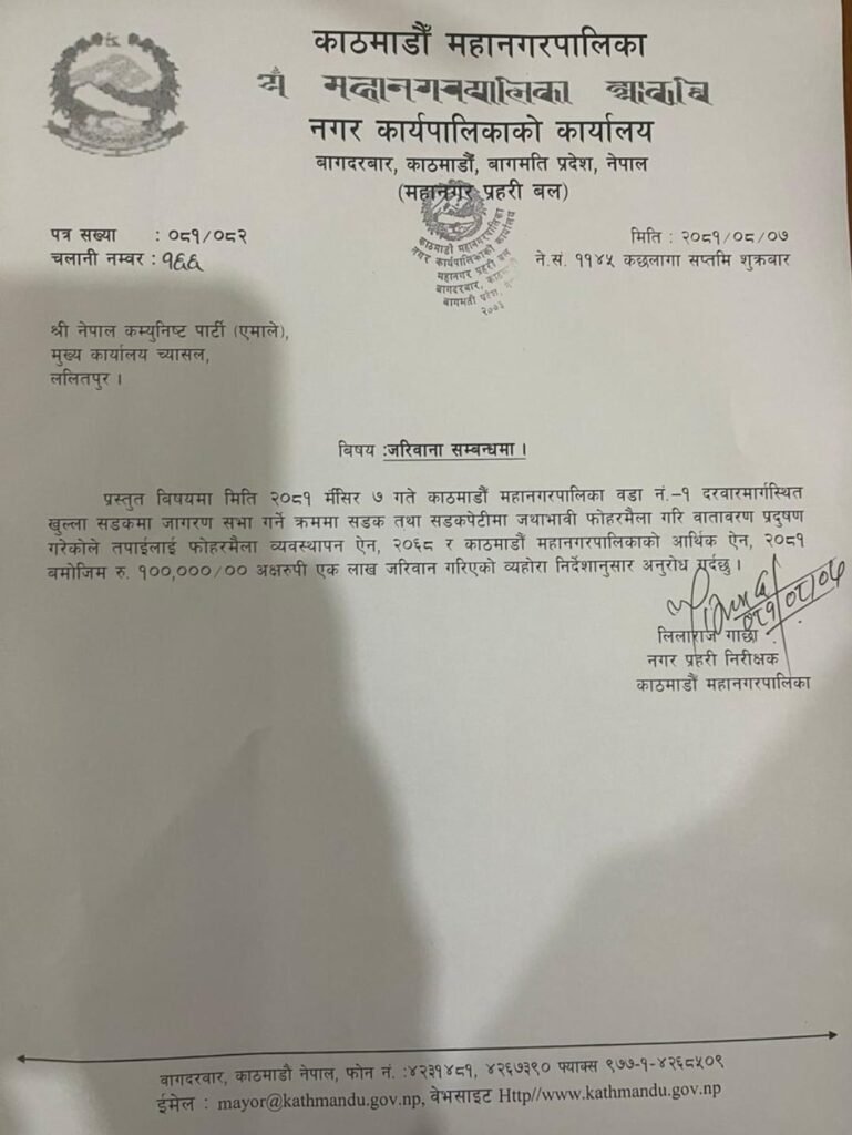 ‘प्रस्तुत विषयमा मिति २०८१ मंसिर ७ गते काठमाडौं महानगरपालिका वडा नं. १ दरबारमार्गस्थित खुल्ला सडकमा जागरण सभा गर्ने क्रममा सडक तथा सडकपेटीमा जथाभावी फोहरमैला गरि वातावरण प्रदूषण गरेकोले तपाईंलाई फोहरमैला व्यवस्थापन ऐन, २०६८ र काठमाडौं महानगरपालिकाको आर्थिक ऐन, २०८१ बमोजिम एक लाख रुपैयाँ जरिवाना गरिएको व्यहोरा निर्देशानुसार अनुरोध गर्दछु’,  नगर प्रहरी निरीक्षक लीलाराजा गाछाले लेखेको पत्रमा भनिएको छ ।