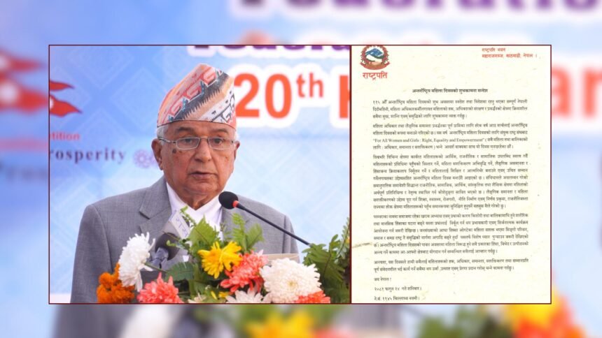 काठमाडौं । राष्ट्रपति रामचन्द्र पौडेलले शिक्षा, स्वास्थ्य, रोजगारी, नीति निर्माण एवम् निर्णय प्रकृयाजस्ता राज्यका हरेक क्षेत्रमा महिलाहरूको पहुँच समानरूपमा सुनिश्चित हुनुपर्ने महसुस गरेको गरेको बताएका छन् ।